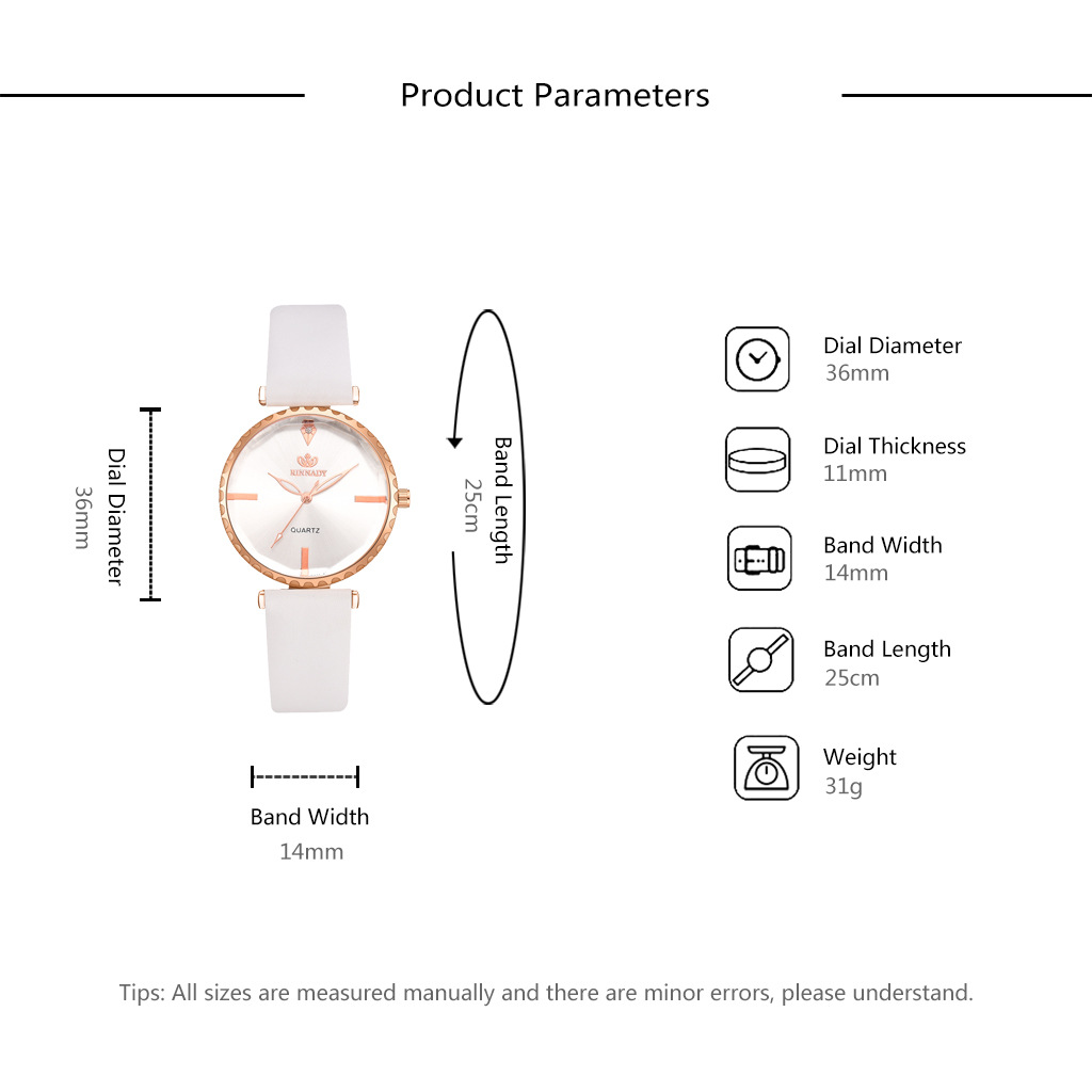 Elevate your style with our stunning selection of women's quartz watches that seamlessly blend elegance and functionality. Designed for the modern woman, these watches are perfect for any occasion, whether you're dressing up for a special event or going for a casual outing. With a simple yet stylish design, the watch features a surface diameter of 32mm and a case diameter of 36mm, making it a perfect fit for your wrist. The dial thickness of 11mm adds a touch of sophistication, while the 14mm wide strap, crafted from durable PU material, ensures comfort throughout the day. Weighing in at just 31g, you’ll barely notice you’re wearing it! Plus, our watches come in a variety of colors to suit your unique style. Choose from classic shades like White, Black, Blue, Coffee, and Rose Red, or opt for a complete set that includes a matching bracelet for a coordinated look.